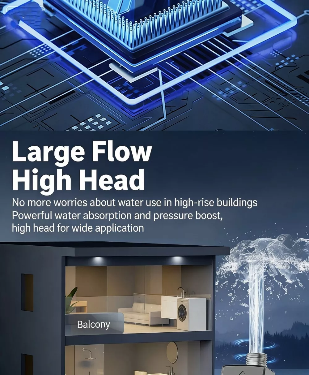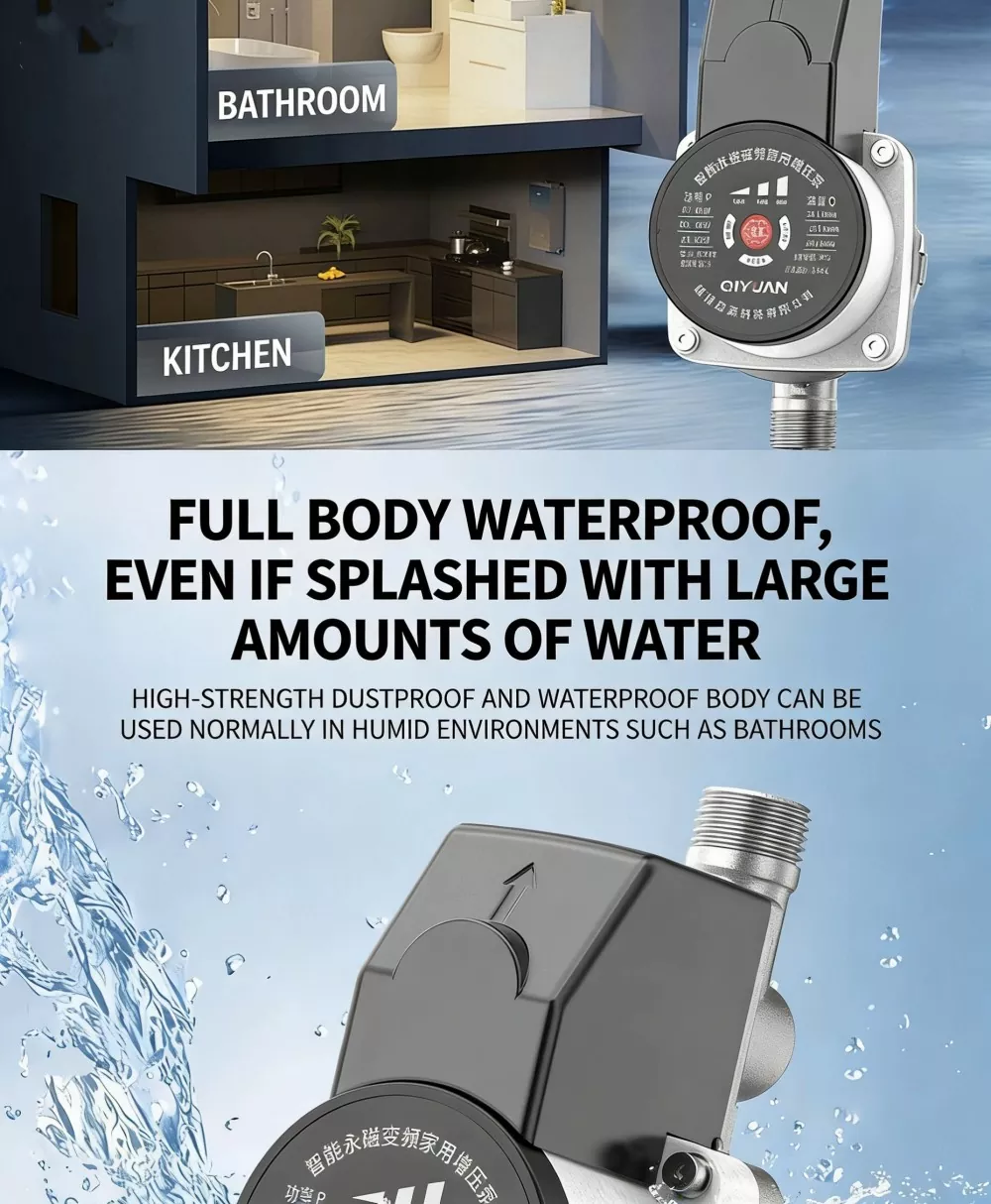 Intelligente Start-Stop Controle: Het ingebouwde, zeer gevoelige waterstroomsensorapparaat detecteert automatisch de watervraag, start de pomp wanneer water wordt gebruikt en schakelt deze uit wanneer de waterstroom stopt. Het voorkomt drooglopen van het pomplichaam, vermindert mechanische slijtage en verlengt effectief de levensduur van de hele unit.