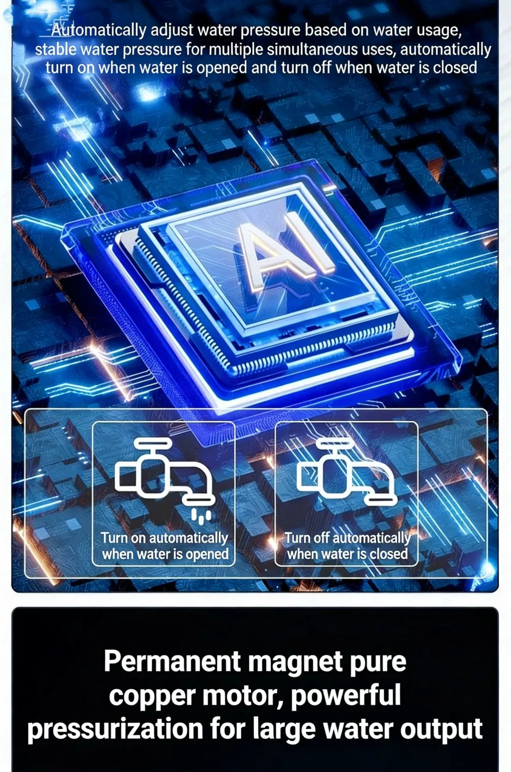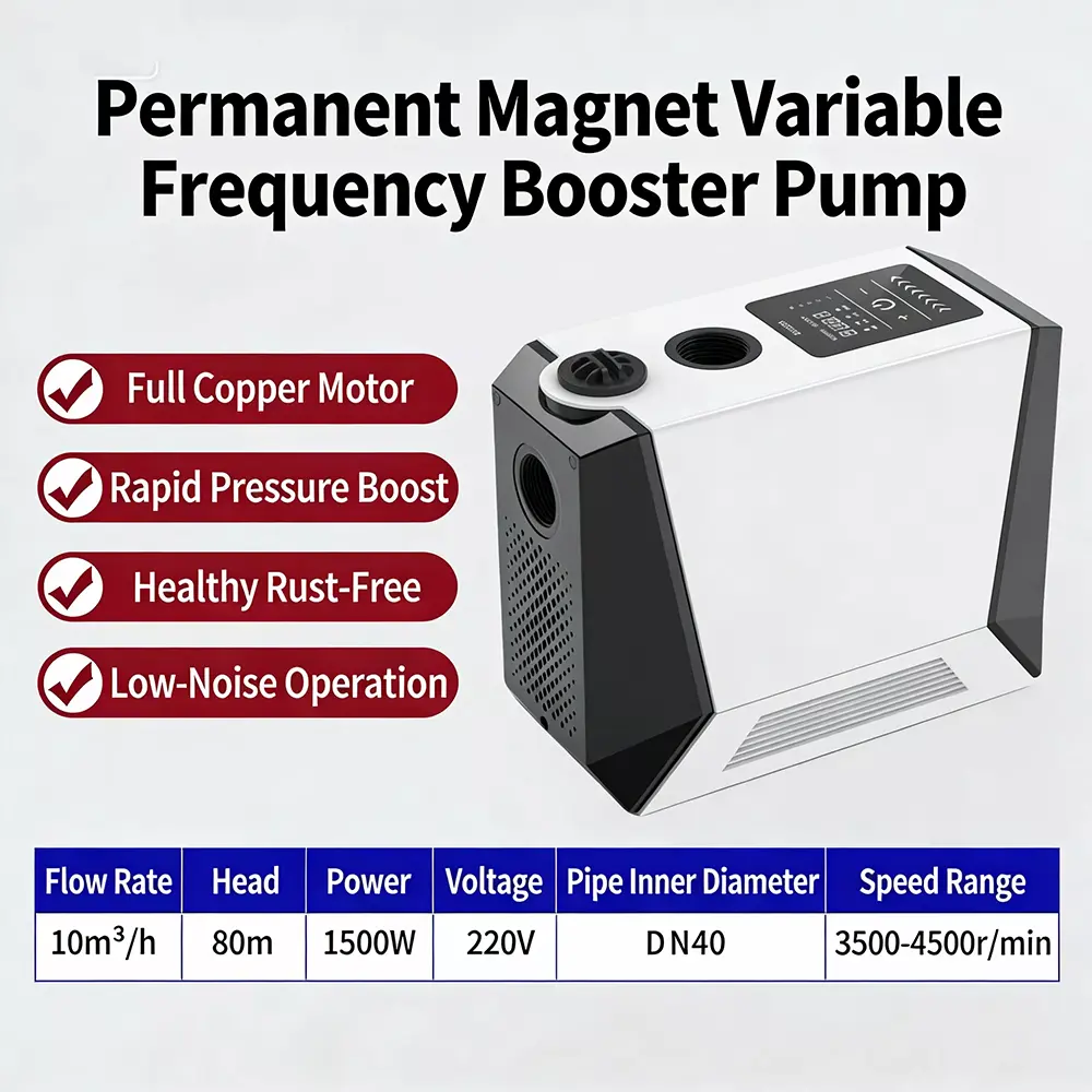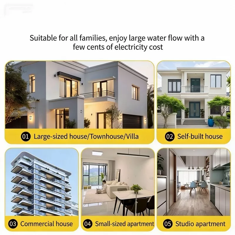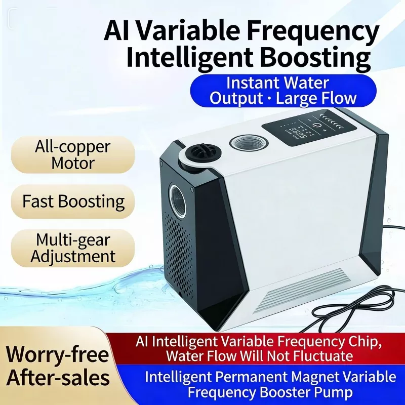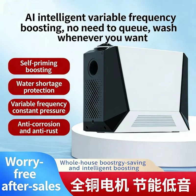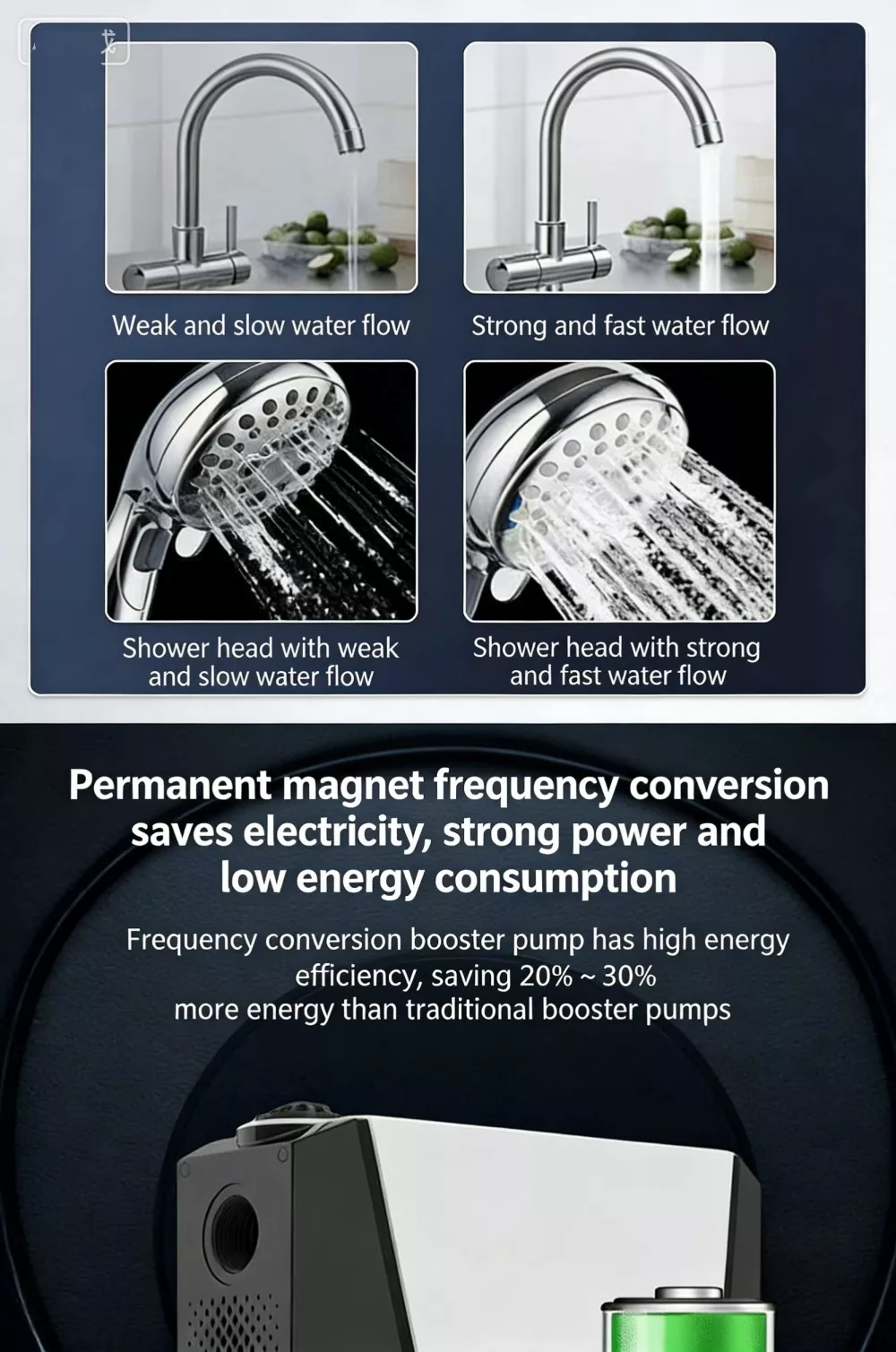Deze grote intelligente boosterpomp is speciaal ontworpen voor grote platte appartementen en villa's en maakt gebruik van geavanceerde borstelloze, puur koperen motortechnologie met permanente magneet, gecombineerd met een intelligent regelsysteem met variabele frequentie. Het realiseert automatische start-stop- en traploze snelheidsverhogingsfuncties met meerdere versnellingen. Uitgerust met een digitaal bedieningsscherm, heeft het een stijlvol uiterlijk, een kleine footprint en eenvoudige installatie. De grote intelligente boosterpomp lost perfect het probleem van onvoldoende huishoudelijke waterdruk op en levert een stabiele, efficiënte en ultrastille watervoorzieningservaring.