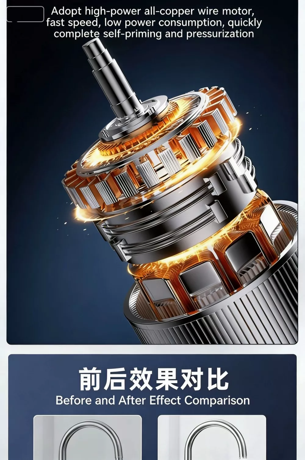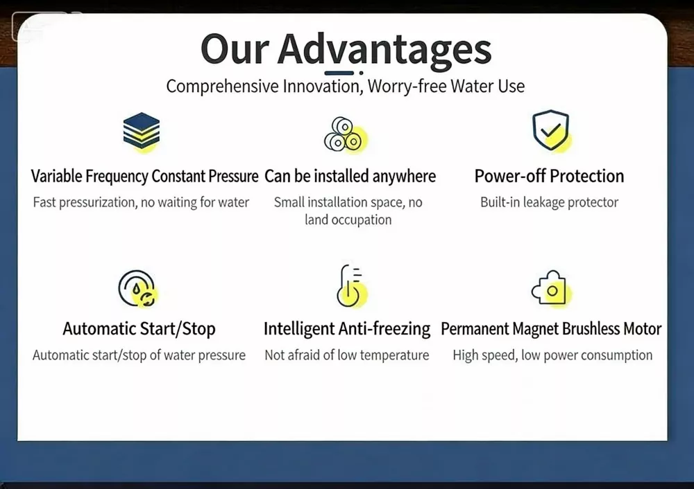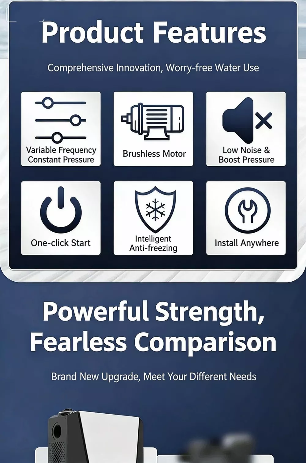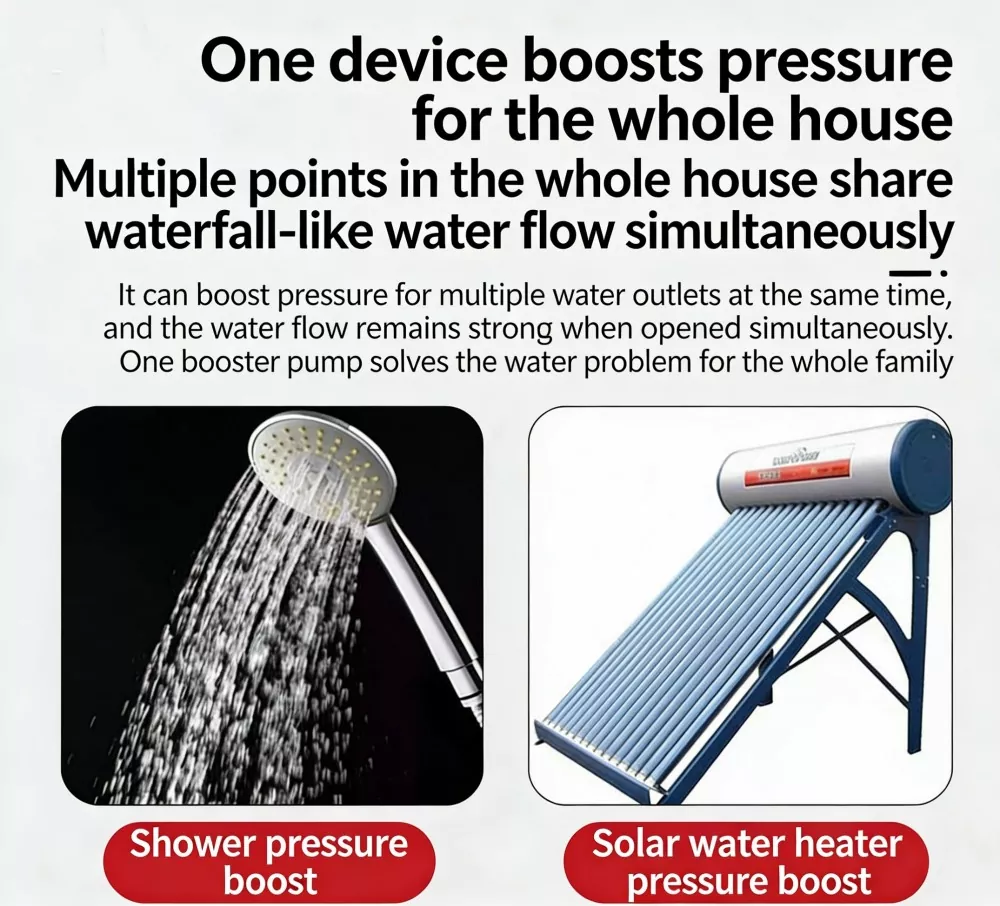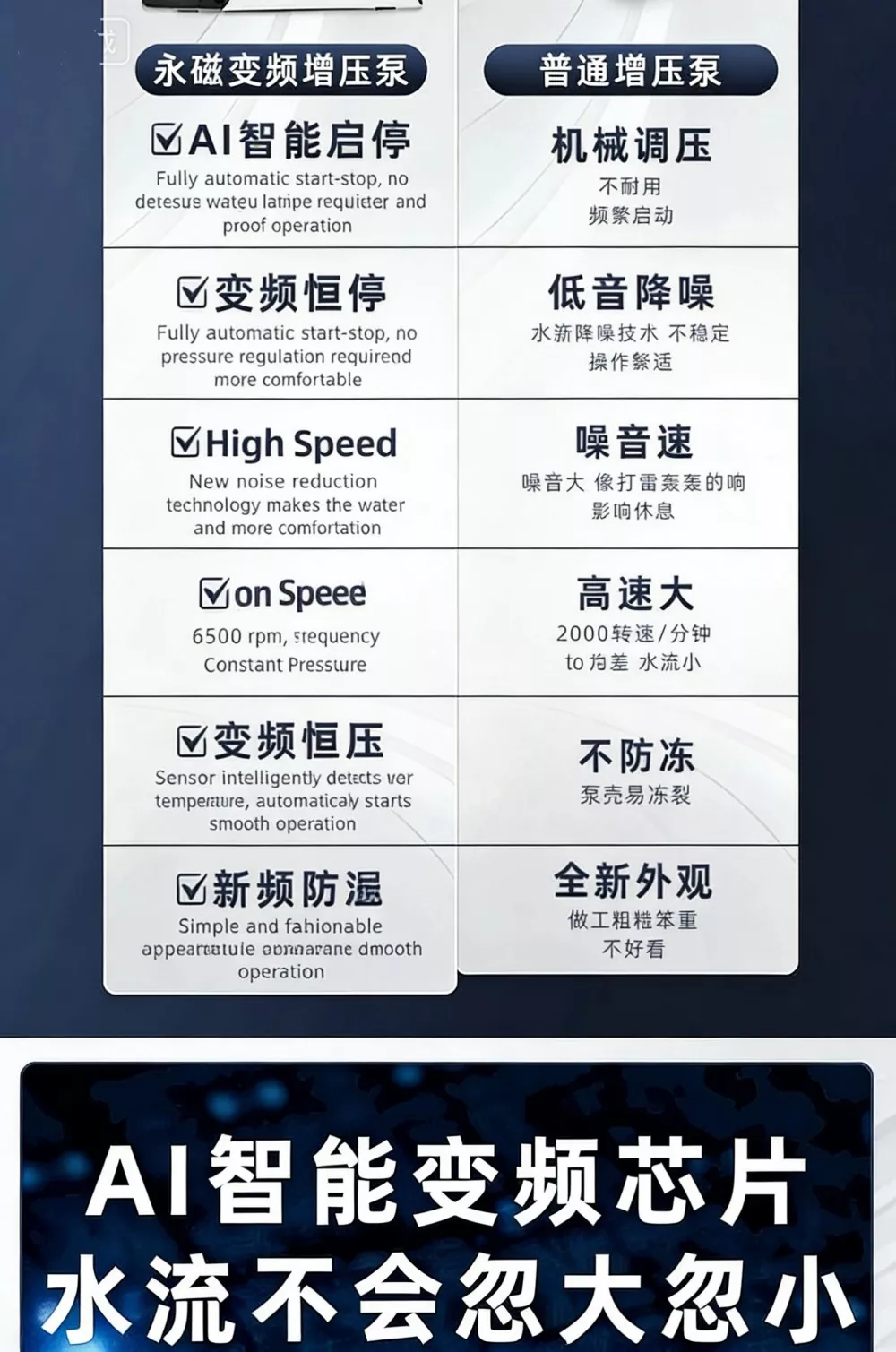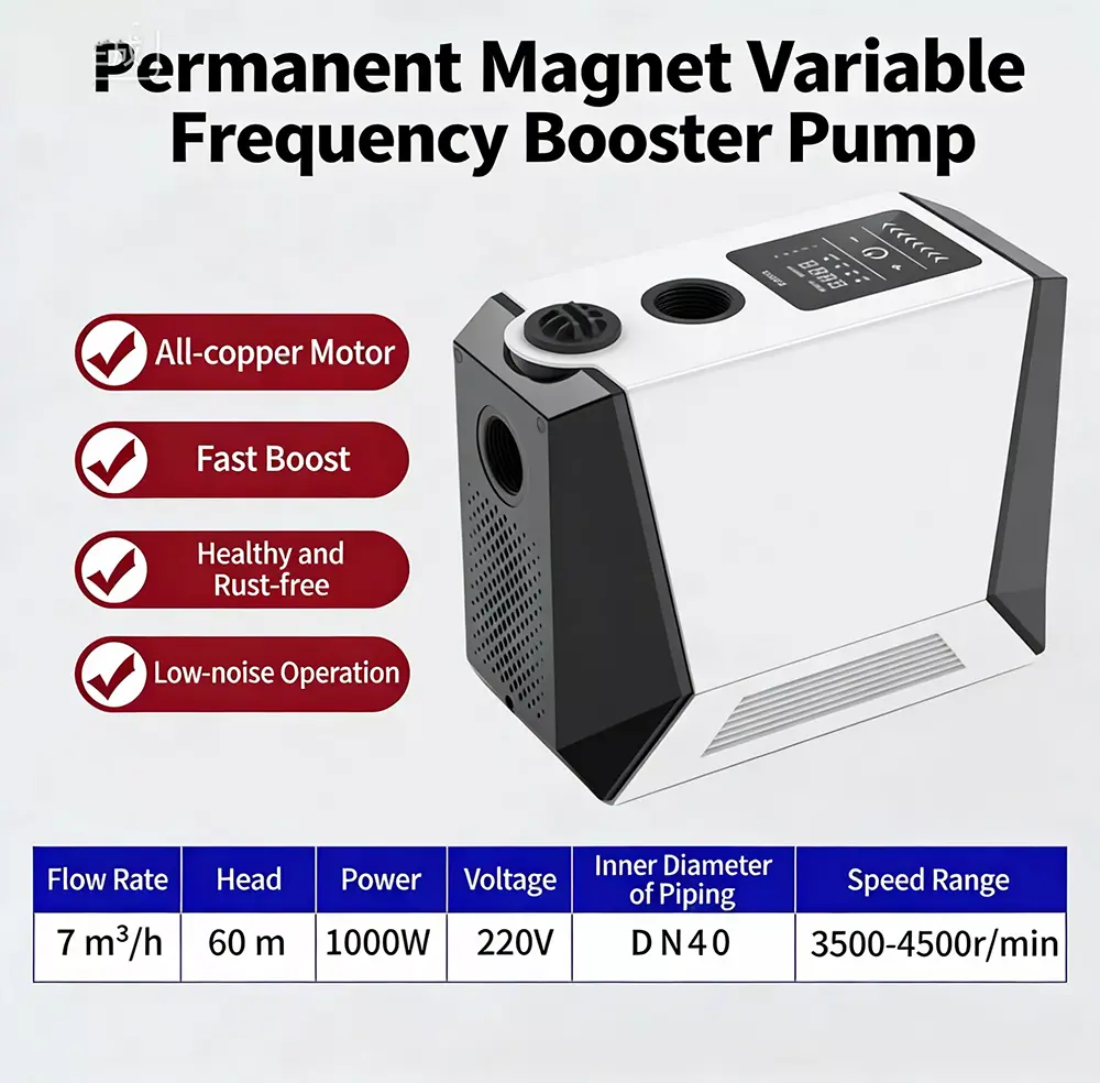Deze grote intelligente boosterpomp is speciaal ontworpen voor grote platte appartementen en villa's en maakt gebruik van geavanceerde borstelloze, puur koperen motortechnologie met permanente magneet, gecombineerd met een intelligent regelsysteem met variabele frequentie. Het realiseert automatische start-stop- en traploze snelheidsverhogingsfuncties met meerdere versnellingen. Uitgerust met een digitaal bedieningsscherm, heeft het een stijlvol uiterlijk, een kleine footprint en eenvoudige installatie. De grote intelligente boosterpomp lost perfect het probleem van onvoldoende huishoudelijke waterdruk op en levert een stabiele, efficiënte en ultrastille watervoorzieningservaring.