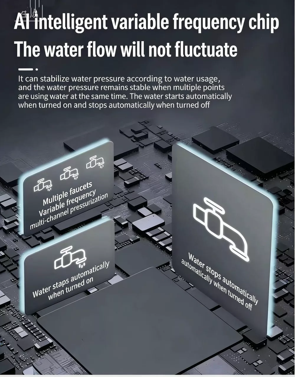 Ingebouwd intelligent besturingssysteem ondersteunt automatisch starten en stoppen. Het past de rotatiesnelheid automatisch aan op basis van de watervraag met traploze snelheidsregeling met 6 versnellingen om een stabiele waterdruk te behouden. Eenvoudige en flexibele aanpassing aan de werkelijke gebruiksbehoeften.
