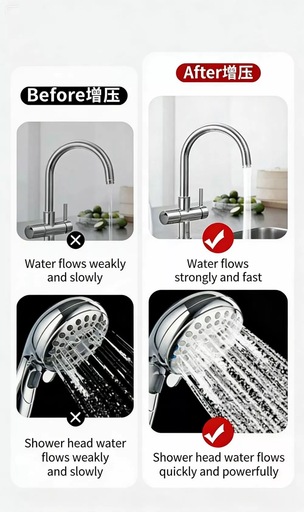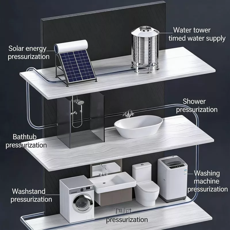 Grote flatappartementen: herstel de lage waterdruk op hoge verdiepingen en zorg voor een stabiele watervoorziening voor douches en keukens.