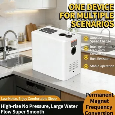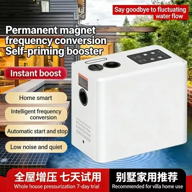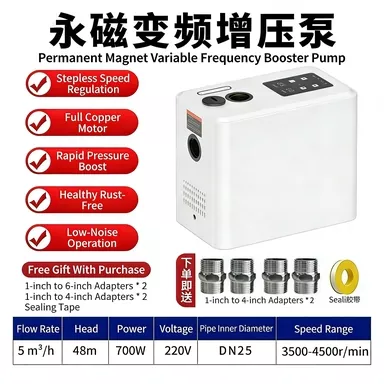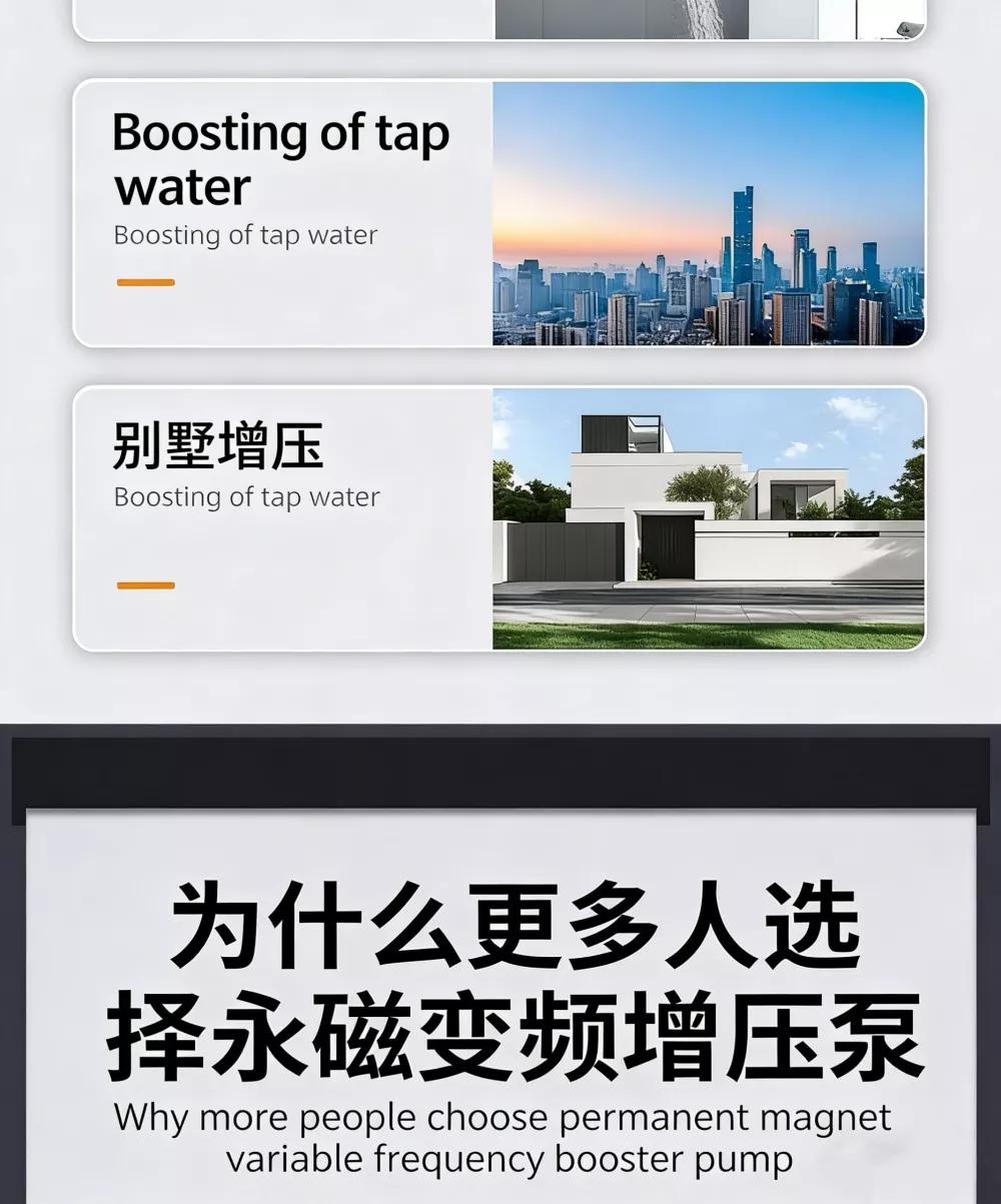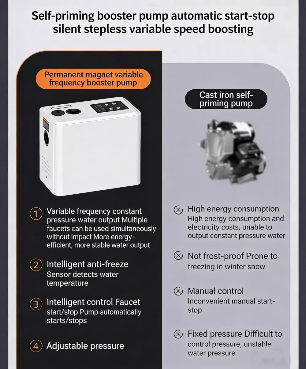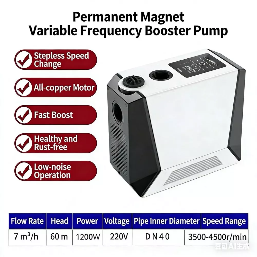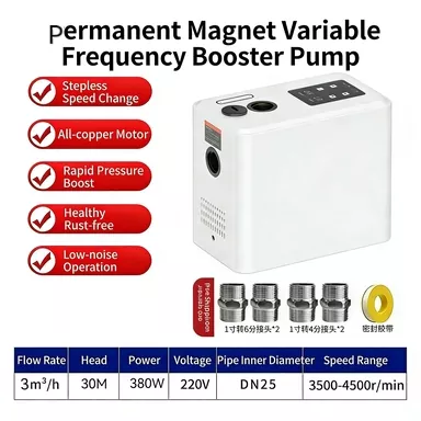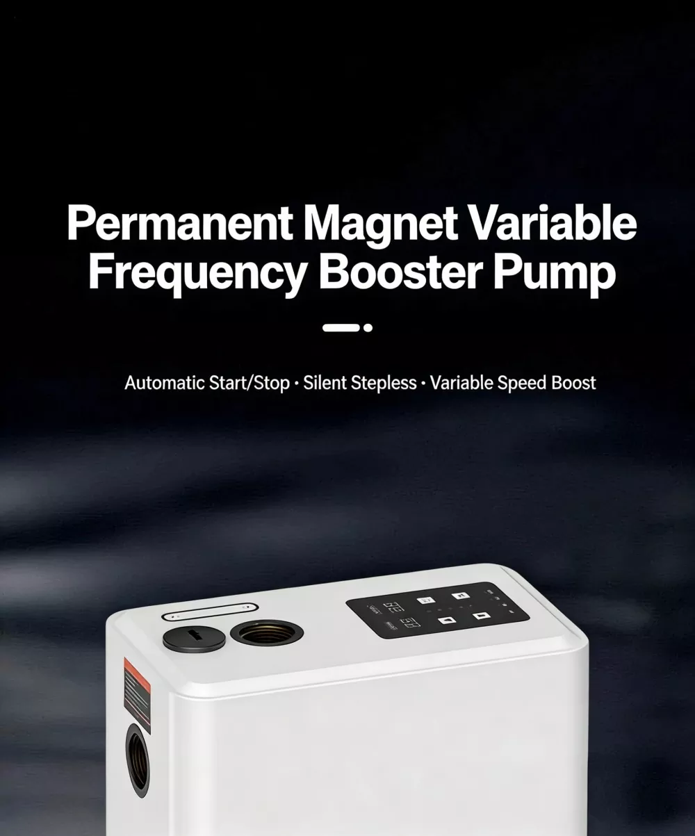 Wanneer u op zoek bent naar een hoogwaardige oplossing voor het verhogen van de waterdruk voor huishoudelijk gebruik, is de boosterpomp met variabele frequentie met permanente magneet uw superieure keuze. Vergeleken met gewone boosterpompen op de markt, is ons product uitgerust met een volledig intelligent besturingssysteem, een stabiele constante drukfunctie met variabele frequentie, een ultra-laag geluidsontwerp, een snelle motor met hoog vermogen, intelligente antivriesbescherming en een compact, stijlvol uiterlijk. Het lost perfect de veel voorkomende tekortkomingen van traditionele pompen op, zoals omslachtige handmatige bediening, onstabiele waterdruk, hoog bedrijfsgeluid, gemakkelijke bevriezingsschade in de winter en omvangrijke en moeilijke installatie.