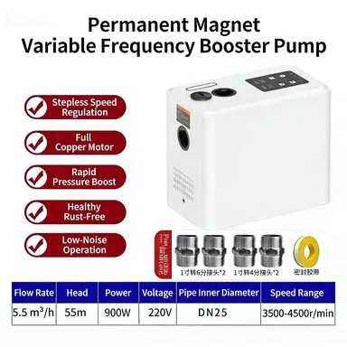 Permanente magneet boosterpomp met variabele frequentie kan op maat worden gemaakt, perfect voor lage waterdruk thuis. Sterke zelfaanzuiging tot 8 meter, snelle drukverhoging, constante waterstroom. Stil, energiebesparend, eenvoudige installatie. Ideaal voor huishoudelijke kranen, douches en boilers.