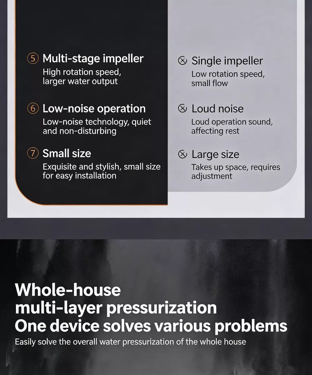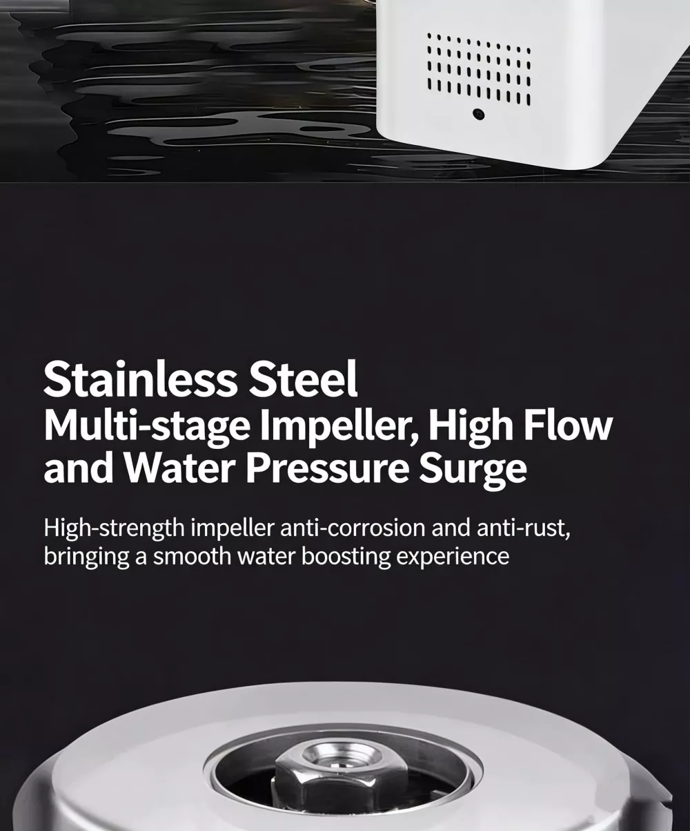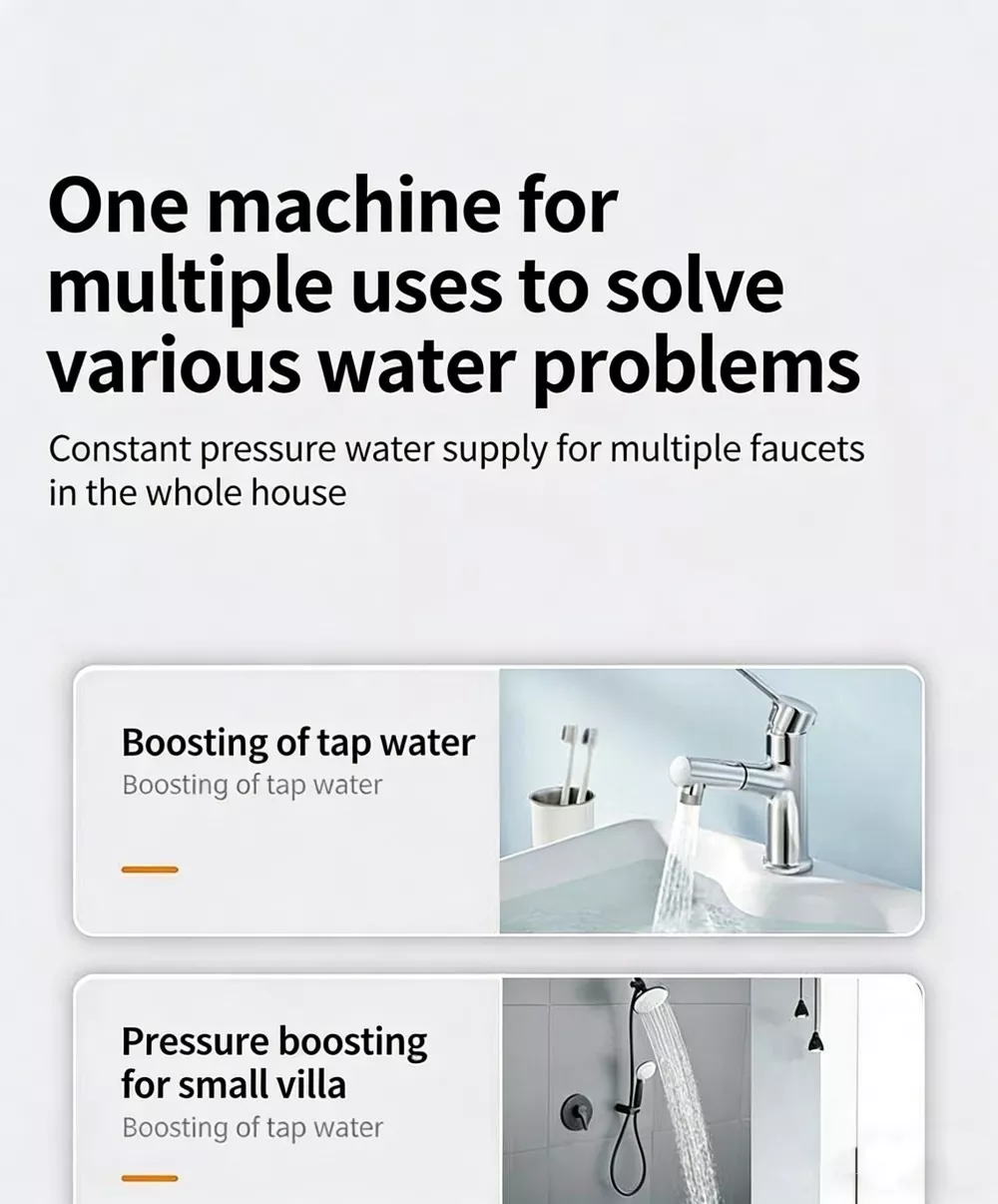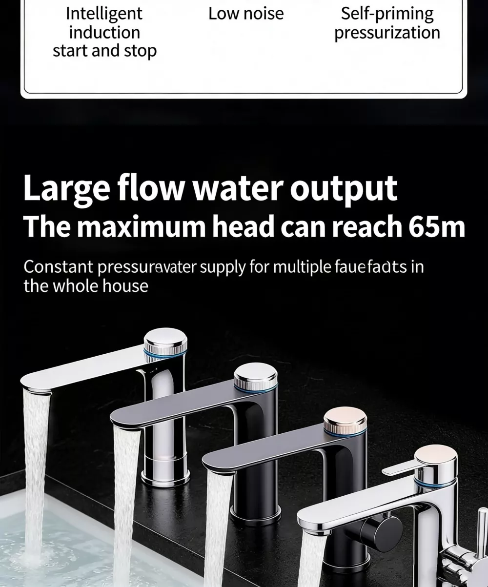 Hogesnelheidsmotor: de ingebouwde hogesnelheidsmotor van 6500 tpm zorgt voor een hoog vermogen, levert een sterke en stabiele wateropbrengst met een groot debiet en lost het probleem van onvoldoende waterdruk in het huishouden grondig op.