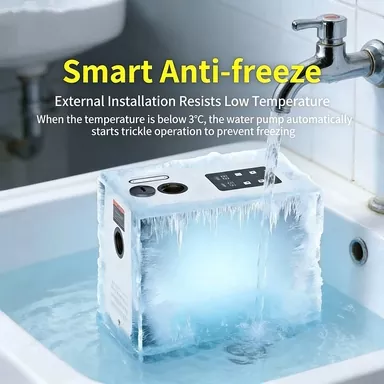 Slimme antivries: met een intelligent temperatuursensorsysteem werkt het automatisch op lage snelheid wanneer de omgevingstemperatuur lager is dan 3℃, waardoor effectief wordt voorkomen dat het pomplichaam en de waterleidingen bevriezen en barsten bij koud weer.